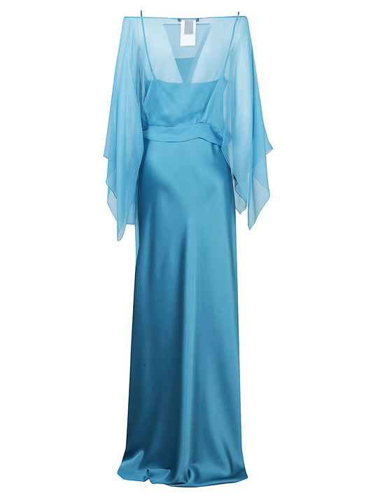 ABITO LUNGO IN SATIN CON MANTELLINA IN CHIFFON STACCABILE